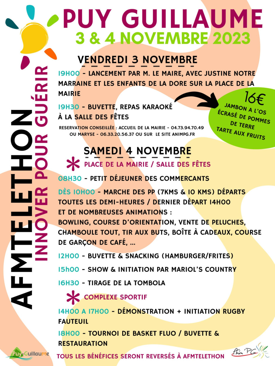 Anim'PG propose un repas à la salle des fêtes de Puy-Guillaume au profit du Téléthon le vendredi 3 novembre à partir de 19H.